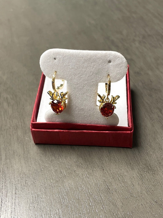 red cubic zirconia gold plated reindeer earrings