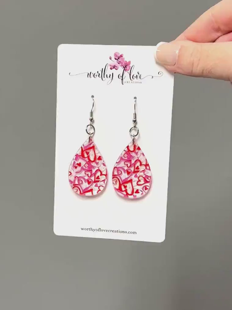 Mixed heart print teardrop red pink and white stainless steel statement earrings