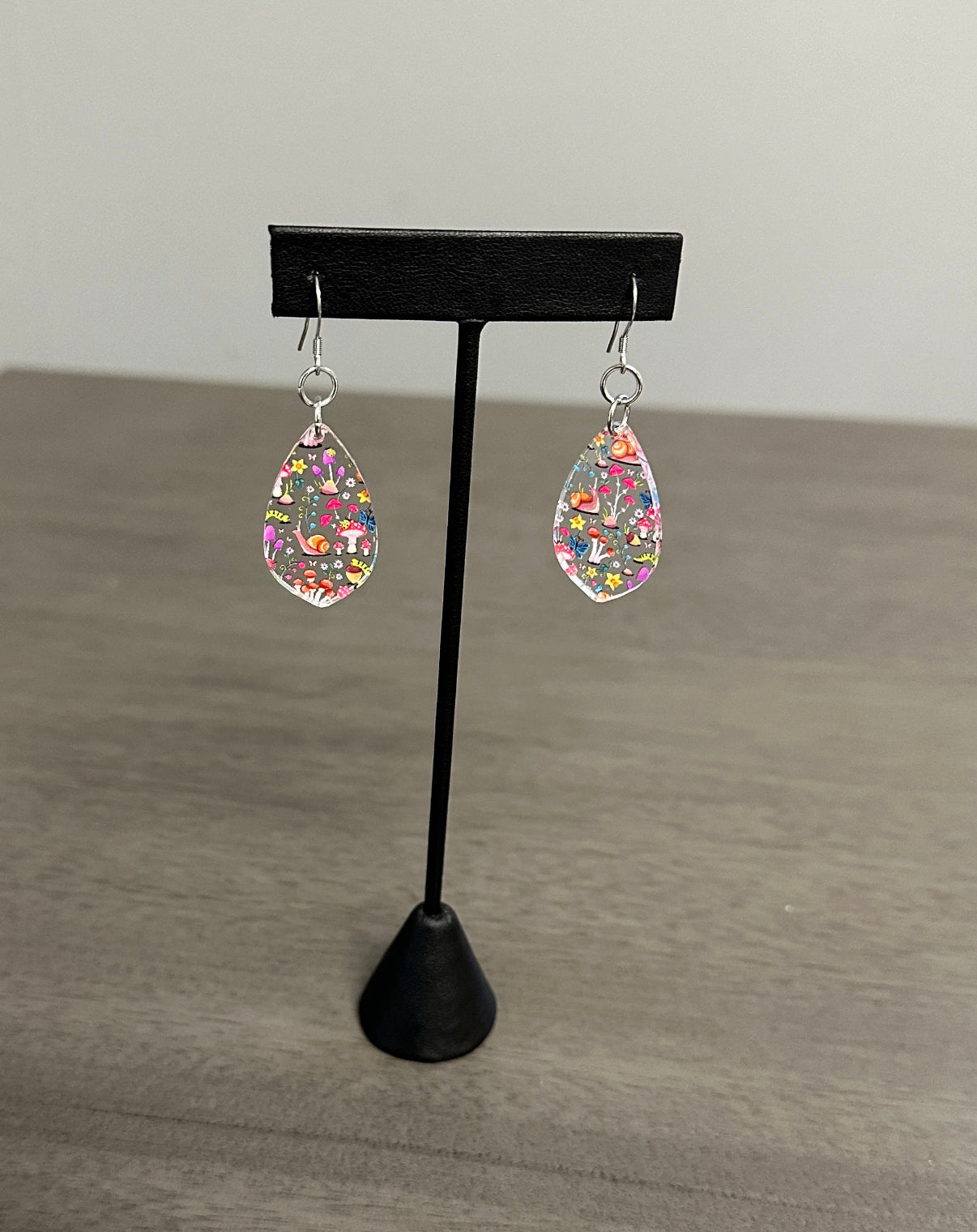 These stainless steel and acrylic earrings feature a charming print of snails, mushrooms, and caterpillars. With their unique design and durable materials, these earrings are both stylish and long-lasting. Perfect for adding a touch of nature to any outfit.